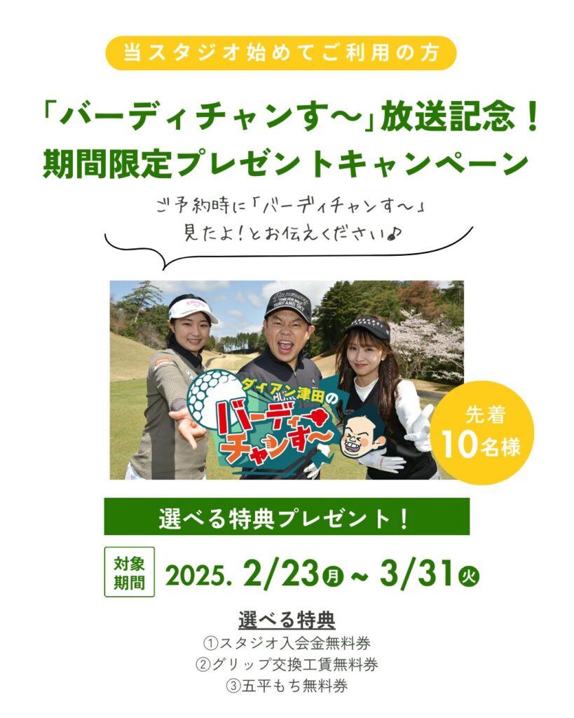「番組を見てゴルフのモチベーションが上がった!」「津田さんたちが訪れたスタジオで練習してみたい!」 そんな「バーディチャンす〜」視聴者の皆様へ、特別なプレゼントキャンペーンをご用意しました。
